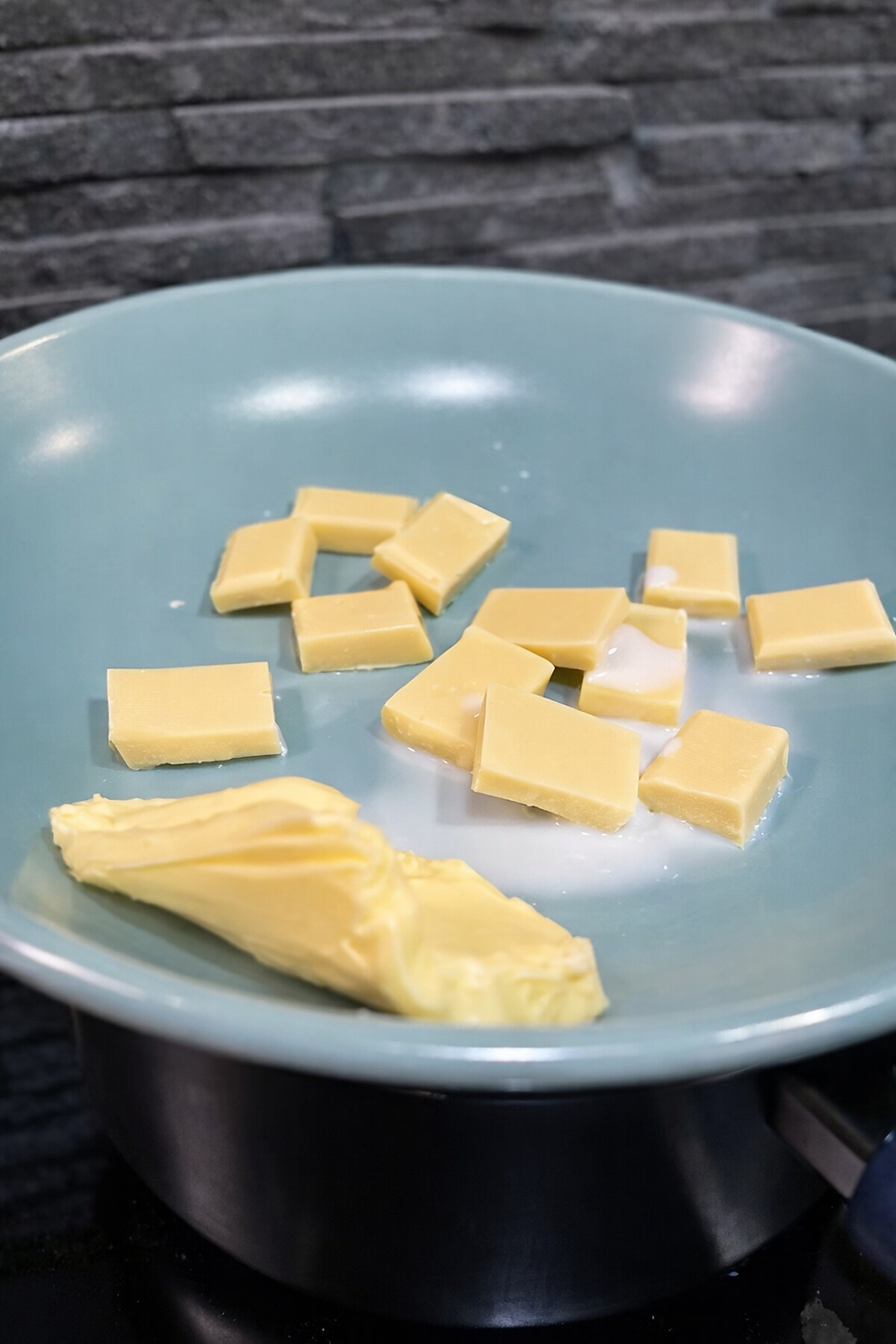 Smält chokladen över ett vattenbad och blanda ihop med mjölk och smör. Blanda i florsockret och rör ihop till en slät glasyr.