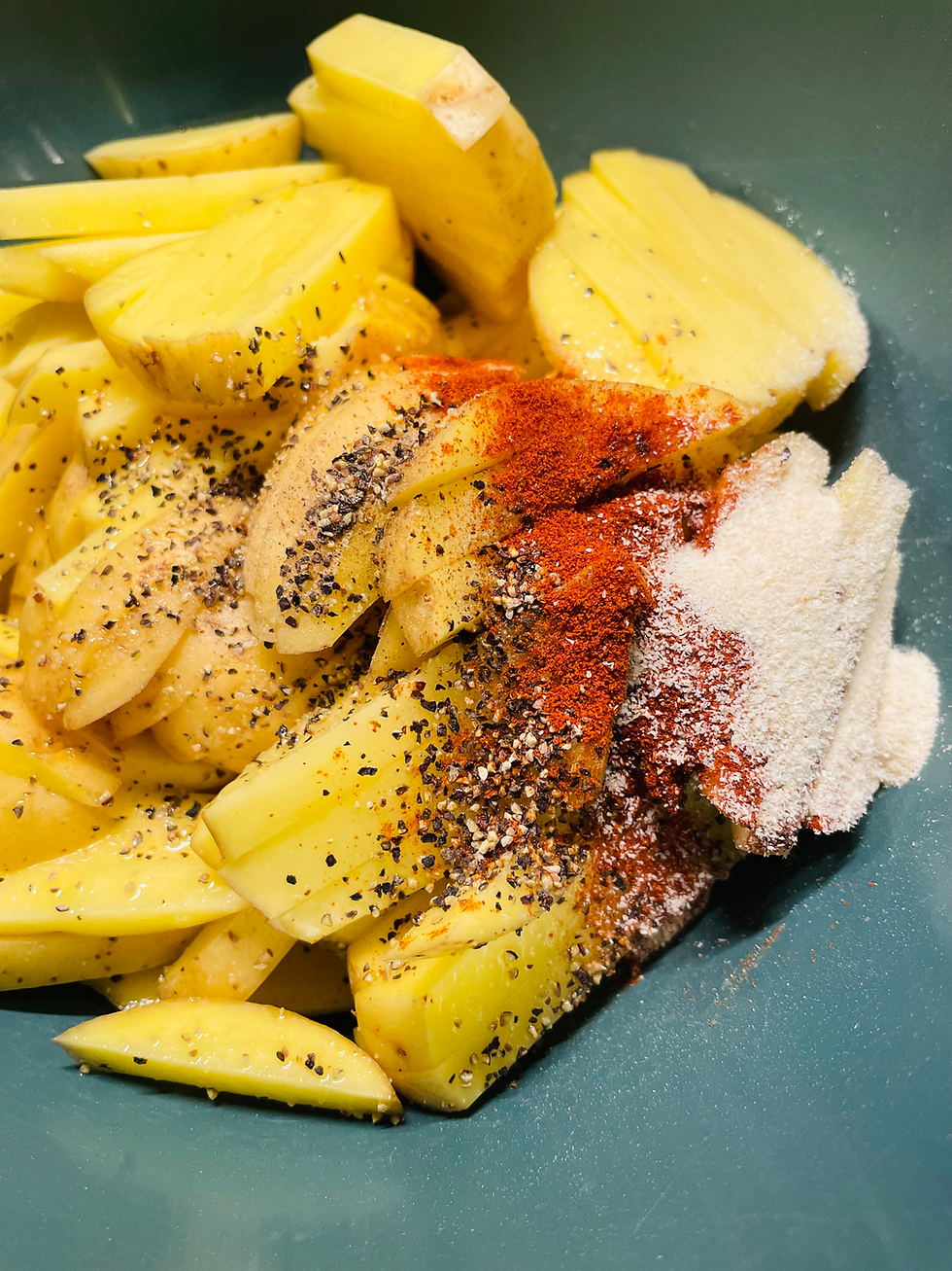 Potatis, olja och kryddor ( inte vitlöken) blandas ihop en bunke 💕.